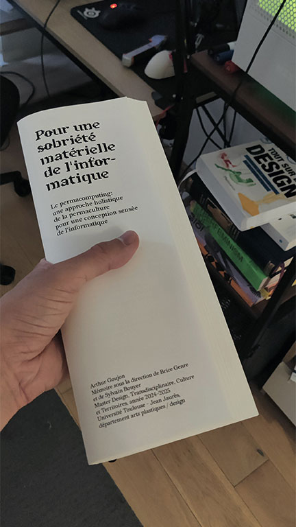 Les limites planétaires et la décroissance soulignent la nécessité urgente de repenser fondamentalement nos modes de consommation et de production, afin de préserver les ressources limitées de notre planète et de minimiser notre impact sur l’environnement. Dans ce contexte, le permacomputing émerge comme un mouvement novateur qui cherche à intégrer les principes de la permaculture, (durabilité, rendement et résilience) dans le domaine de l’informatique et de la technologie. Au cœur du permacomputing se trouve la conscientisation de notre utilisation des machines et des chaînes de production des technologies informatiques. Ce principe vise aussi à contrer l’obsolescence programmée, c’est-à-dire le fait délibéré des industriels de créer des objets à dates de péremption sans possibilité de réparation. Cela implique pour le permacomputing de privilégier les solutions modulaires et réparables, ainsi que de favoriser le réemploi des équipements informatiques plutôt que leur remplacement constant. Dans cette optique, une longévité programmée est encouragée, mettant l’accent sur la conception de produits électroniques facilement réparables. Il s’agit donc de l’importance que nous donnons à nos objets. Comment alors changer notre point de vue sur et la distinction sociale de nos ordinateurs portables, grâce à des objets non plus de cherté, mais des objets de fierté ?