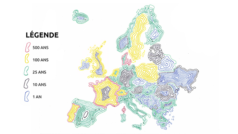 Cette carte de l’Europe représente les pays par date d’acquisition de souveraineté. Avec des stylos à bille, je me suis inspiré des cernes des arbres pour représenter l’âge des pays.