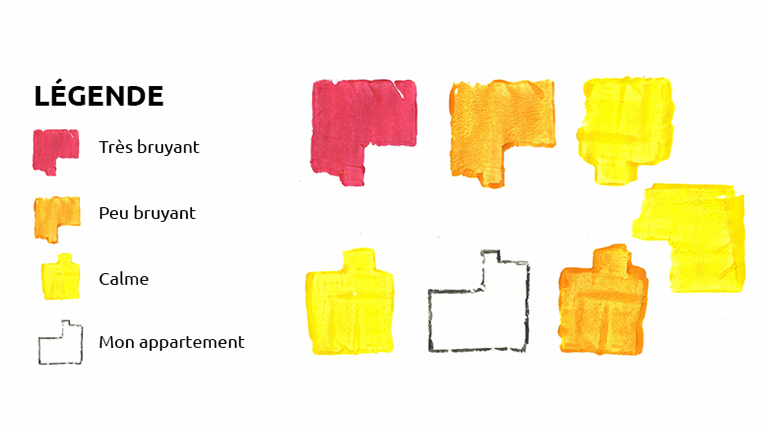 Ceci est une représentation du palier de mon immeuble. Étant entouré, j’entends les moindres bruits des voisins… Étonnement, les plus bruyants, malgré leur position, sont les plus éloignés (ils crient vraiment fort).