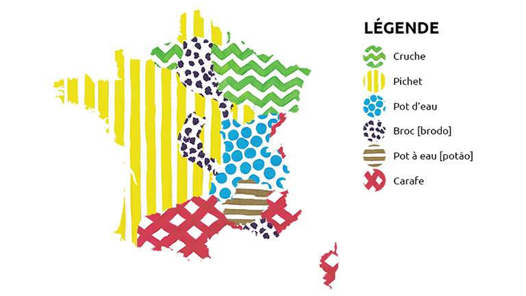 Avec le temps, nous faisons des rencontres. Ces rencontres ont des caractères, mais aussi des façons de parler différentes des nôtres, en fonction des régions. Cette carte représente différentes manières de parler d’un pichet, ou encore d’un pot à eau à l'échelle national.