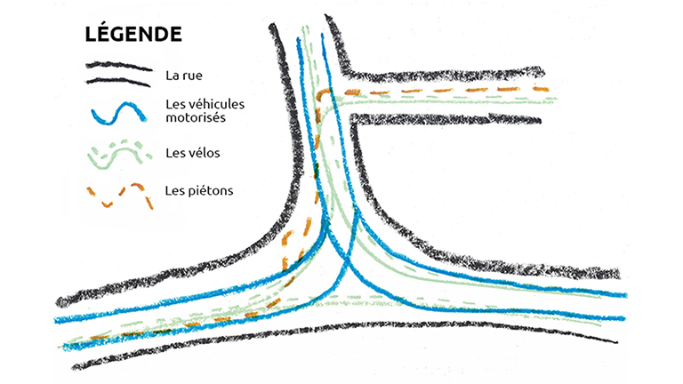 Ces tracés de craies grasses représentent les seules routes visibles depuis mes fenêtres. La légende est triée de l’élément du plus, au moins fréquemment. La rue est forcément toujours visible, alors les piétons se sont faits rares pendant le confinement…