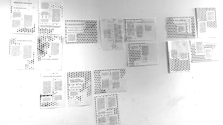 Enfin, il nous a fallu penser le processus pour permettre aux usagers de pouvoir s’exprimer facilement et spontanément. Nous avons donc réalisé un code sur Open Processing qui génère des trames de points pour le verso de nos affiches de manière aléatoire. Ce système nous permet de produire instantanément un grand nombre de propositions. Les personnes ont alors à enregistrer cette image générée par le code et à l’imprimer. Nous avons écrit un second code pour produire le fond des verso. Il ne reste alors plus qu’à produire le contenu de l'affiche sur des rectangles blancs et à les coller sur la feuille. Pour finir il faut photocopier ce contenu (les textes avec l’image du recto) sur le dos d’une feuille, avec l’image du verso.