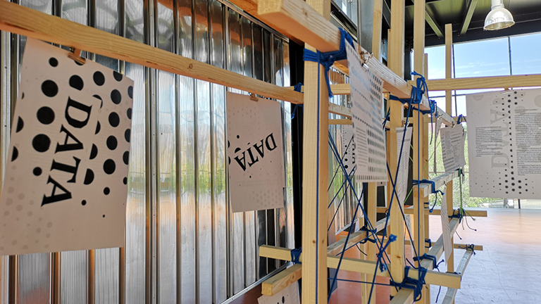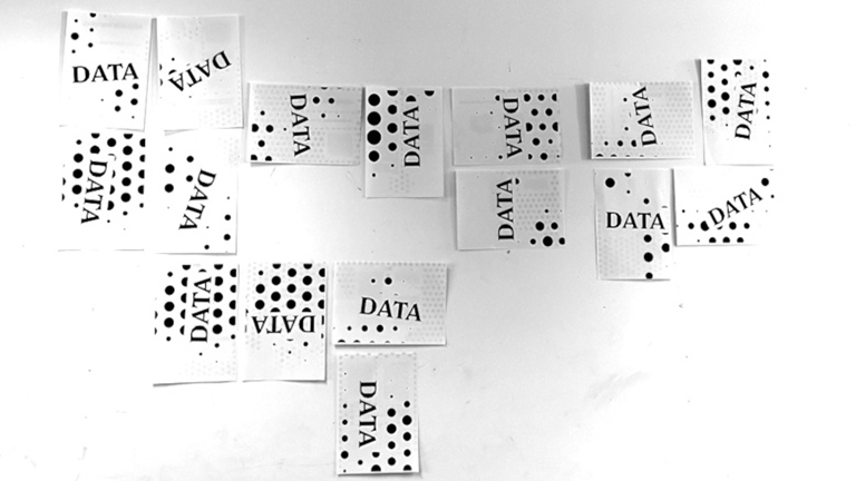 Nous avons ensuite généré un fond qui évoque la thématique des datas données. Pour ce faire, des ronds de différentes tailles placés aléatoirement, autant pour le recto que le verso, ont été utilisés. Le fond sur lequel se place le texte est composé d’un grand nombre de points de petites tailles tandis que pour le dos, les ronds ont une taille plus grande et sont moins présents. Pour ce dernier nous avons décidé d’ajouter le mot "DATA" en grand, placé de manière aléatoire. Ceci permet de comprendre de loin la teneur de l’exposition, et en même temps de faire une petite référence aux dadas.