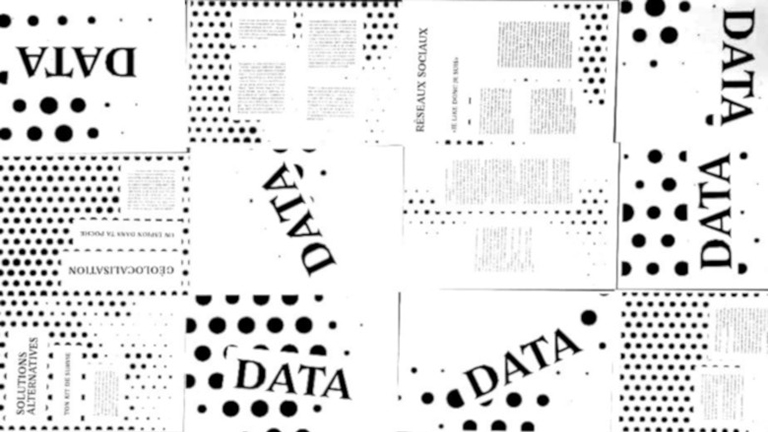 Pour nos supports de communication, nous avons choisi de traiter la thématique de la collecte des données (data). Nous nous sommes informés sur le sujet grâce à une exposition de l’école de Lausanne, que nous avons reprit. Nous avons cherché à créer notre propre typographie de titrage, afin de donner une identité à notre présentation. Pour cela nous sommes parti d’une typo libre de droit que nous avons glitché grâce au site EnFont Terrible. Après plusieurs essai nous nous sommes rendu compte que cette typographie brouille la lecture, ce qui n’était pas le but recherché. Nous avons donc choisi une autre typographie libre de droit plus simple mais assez grasse, qui capte le regard. Pour le corps du texte nous avons préféré une typographie lisible, simple, aérée, sans empattements.
