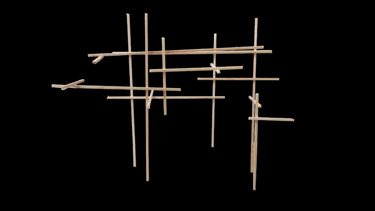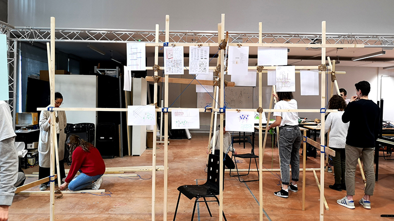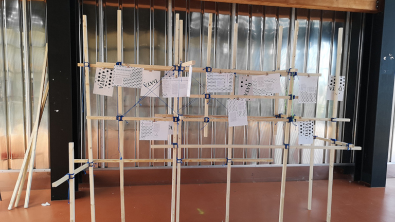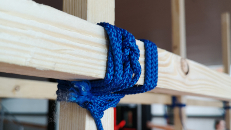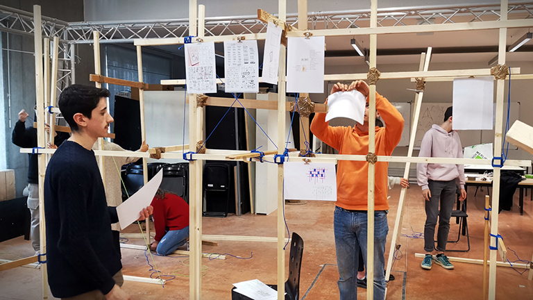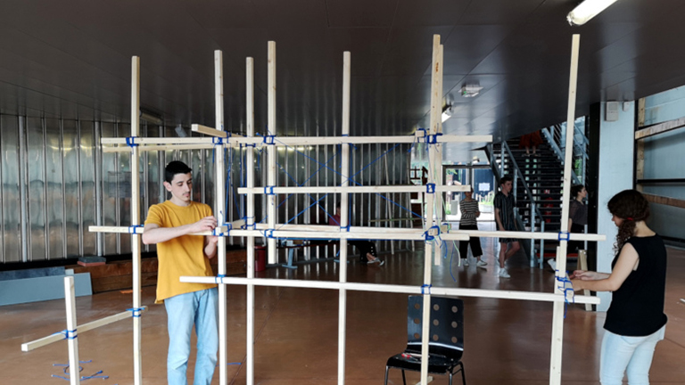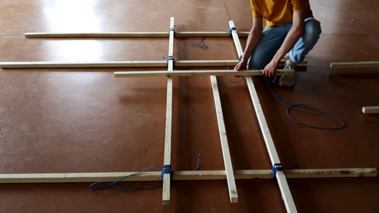 Cette étape nous a aussi permis de réfléchir au processus d’assemblage. Il faudra d’abord monter le premier plan, puis le second. Ensuite il suffira de les lever et de les assembler entre eux grâce aux transversales. Les intersections entre les tasseaux étant composés uniquement de perpendiculaires, ils seront reliés uniquement par des brelages (assemblage en ficelle), facile à apprendre et à mettre en oeuvre.