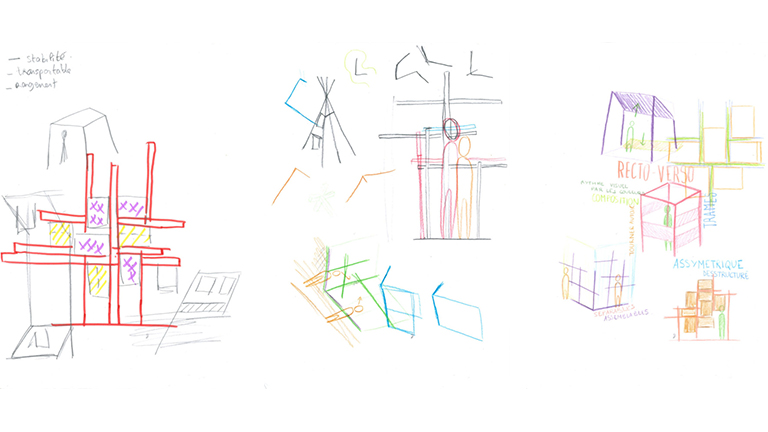 Après plusieurs recherches graphiques, nous avons choisi le parti pris d’une structure composée de verticales et d’horizontales uniquement, qui peut ressembler aux oeuvres de Mondrian. Cet assemblage nous permet de créer une unité et une dynamique harmonieuse. Nous avons réalisé une étude des mesures possibles de la structure à échelle 1, à partir de la taille humaine. Nous avons ainsi déterminé quelles étaient les dimensions de la surface d’affichage, notamment les hauteurs minimale et maximale.
