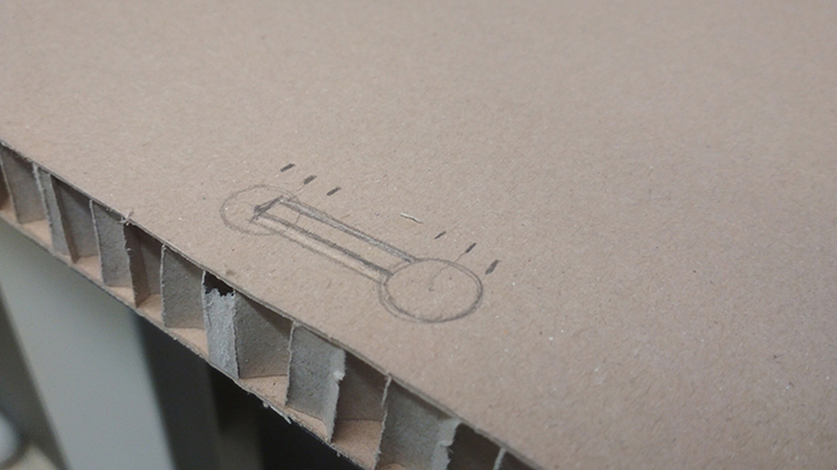 Pour les pans de mur, nous avons récupérer une grande planche immense de carton alvéolé, qui est léger et solide à la fois, d’une épaisseur de 2,5 centimètres. Nous avons découpé nos deux pans de mur à l’intérieur. Chaque pan fait 1,20 mètre de haut et 1 mètre de large.