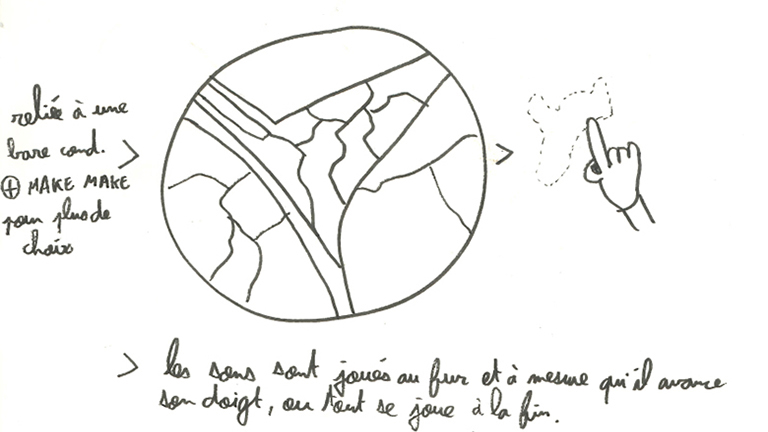 Notre toute première idée est de créer sur un mur, la carte du quartier. La carte une fois touchée, joue des sons. Le but pour l’utilisateur est de retracer son parcours routinier avec son doigt. Cependant, pour faire ceci, nous aurions dû noter l’endroit où nous avons enregistré nos sons. Sans ces données, impossible de cartographier nos enregistrements.