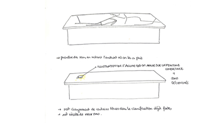 L’idée suivante est celle d’une table interactive. Pourquoi ne pas incliner le mur, devant lequel l’usager prends place ? Il n’a ensuite qu’à toucher les différents rond afin d’activer une animation.