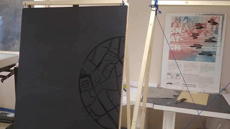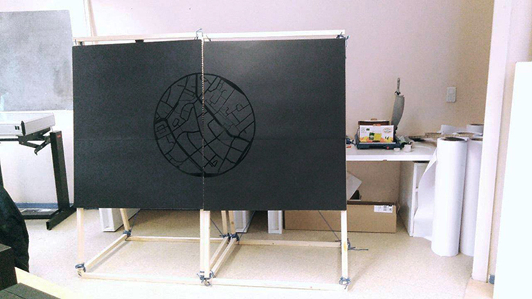 Enfin, nous avons collé dessus de grandes feuilles de papier noir. Ceci fera contraster les animations vidéo-projetées. Pour finir, le plan du quartier à été découpé à l’aide d’une découpe vinyle. Ce dernier est de couleur noir et brillant, pour rester discret car il n’est là que pour clarifier aux yeux des utilisateurs, le projet. De plus, des cercles blancs en vinyle s’ajoutent autour de clous, recouvert d’encre conductrice noire.