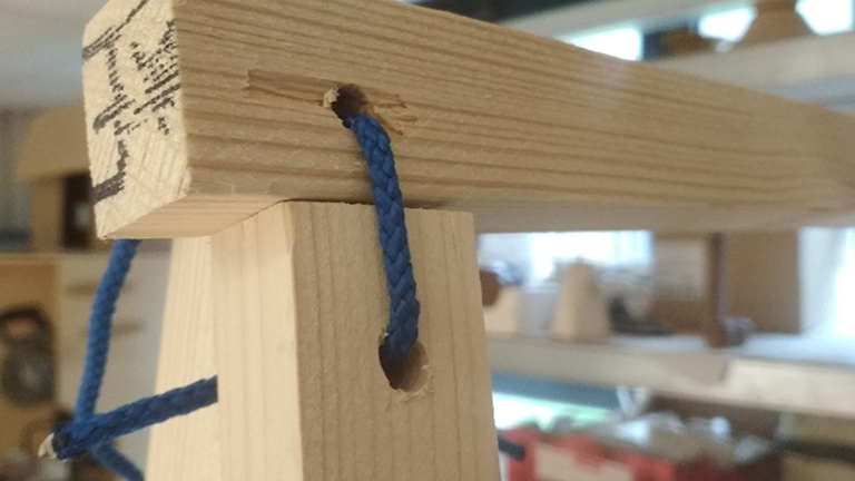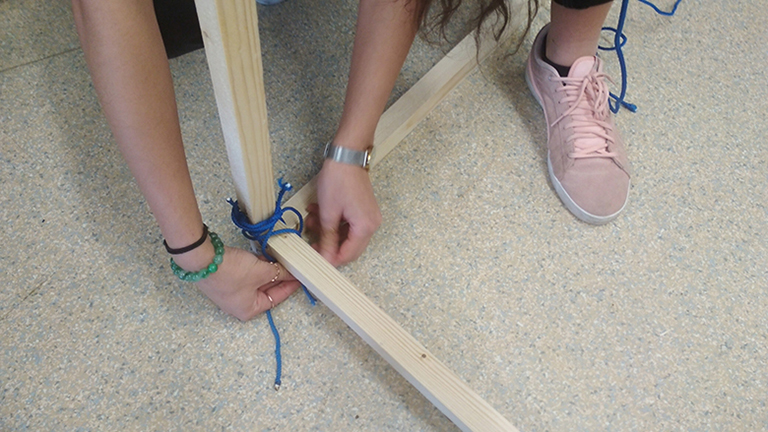 La structure est construite avec des tasseaux en bois de 3 centimètres de côté. Nous avons assemblé ces tasseaux avec de la corde bleue. En perçant les extrémités des tiges de bois, nous pouvons y insérer la corde et simplifier les nœuds, car n’oublions pas que notre structure doit être démontable facilement pour le transport.