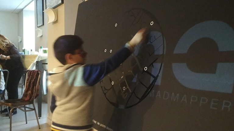 Effectivement, afin de conduire un signal électrique, nous devons utiliser des matériaux conducteurs. Ici des clous, que nous relions avec des pinces crocodiles à l’arrière, à la Bare Conductive. Cette Bare Conductive permet de jouer jusqu’à 12 vidéos dès qu’un signal est transmis. Branché à un ordinateur portable, le vidéo projecteur affiche les vidéos en temps réel grâce à un logiciel de mapping 3D. Étant une licence payante, nous avons utilisé la version gratuite proposée, avec un filigrane du nom de la marque, malheureusement. Ce logiciel est très puissant, il permet d’assigner une touche (ou dans notre cas une tête de clou reliée à une touche) de la Bare Conductive à une vidéo. De plus, l’interface est WYSIWYG, c’est-à-dire que la mise en espace des vidéos est la même à l’écran, que sur le plan vidéo-projeté.