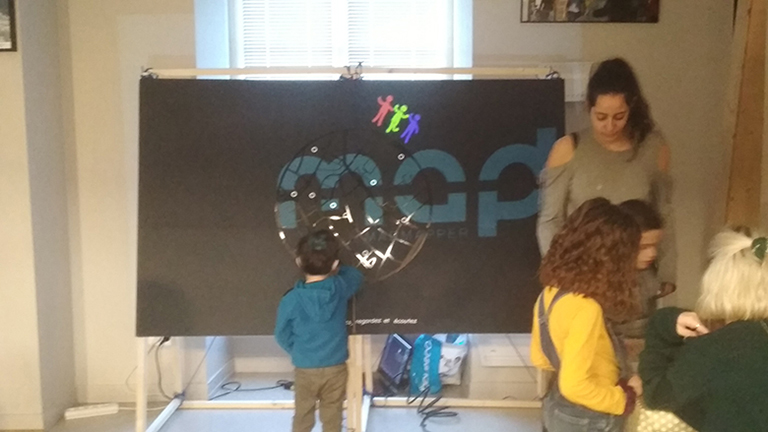 Après plusieurs discussions, nous avons finalement décidé de reprendre le principe du Dazibao, à savoir une structure constituée de tasseaux, facilement démontable et déplaçable. Le mur est constitué de deux parties noires, sur lesquelles ont été collée une carte du quartier. Afin d’attirer le regard de l’usager, des ronds blancs indiques les endroits à toucher. Dès lors que la personne touche le rond, une animation apparaît, en même temps que le son.